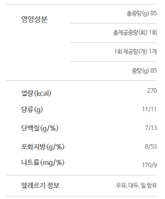 영양성분은 뚜레쥬르에서 제공하는 정보를 가져와봤습니다.