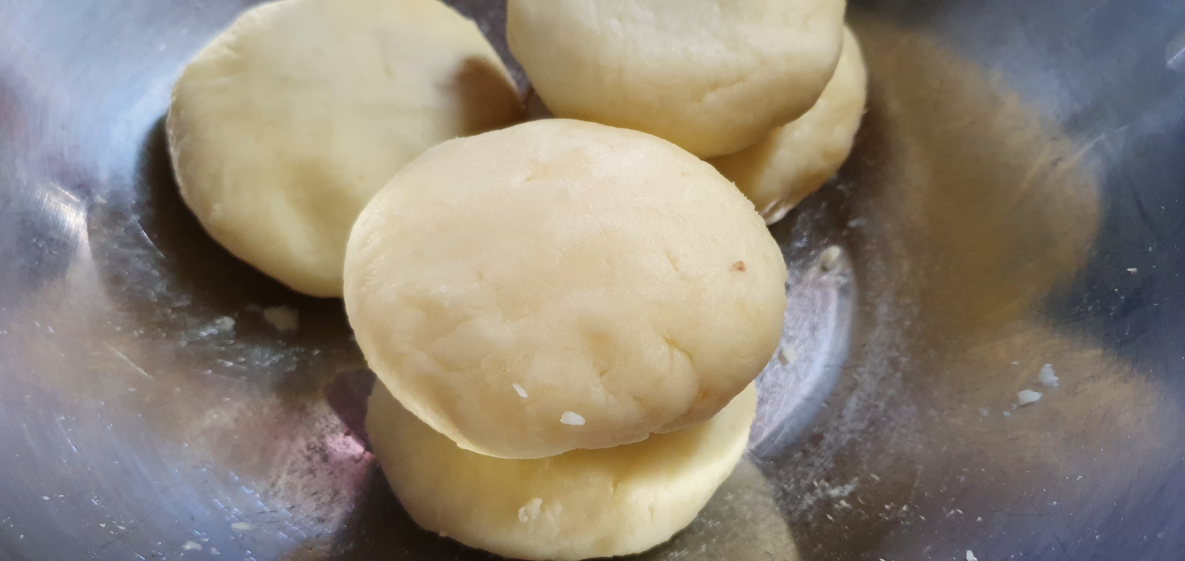 반죽해주시다가 적당히 찰기가 생기고 부드럽다 판단되실 때 만두처럼 속재료를 넣어주시면 됩니다.