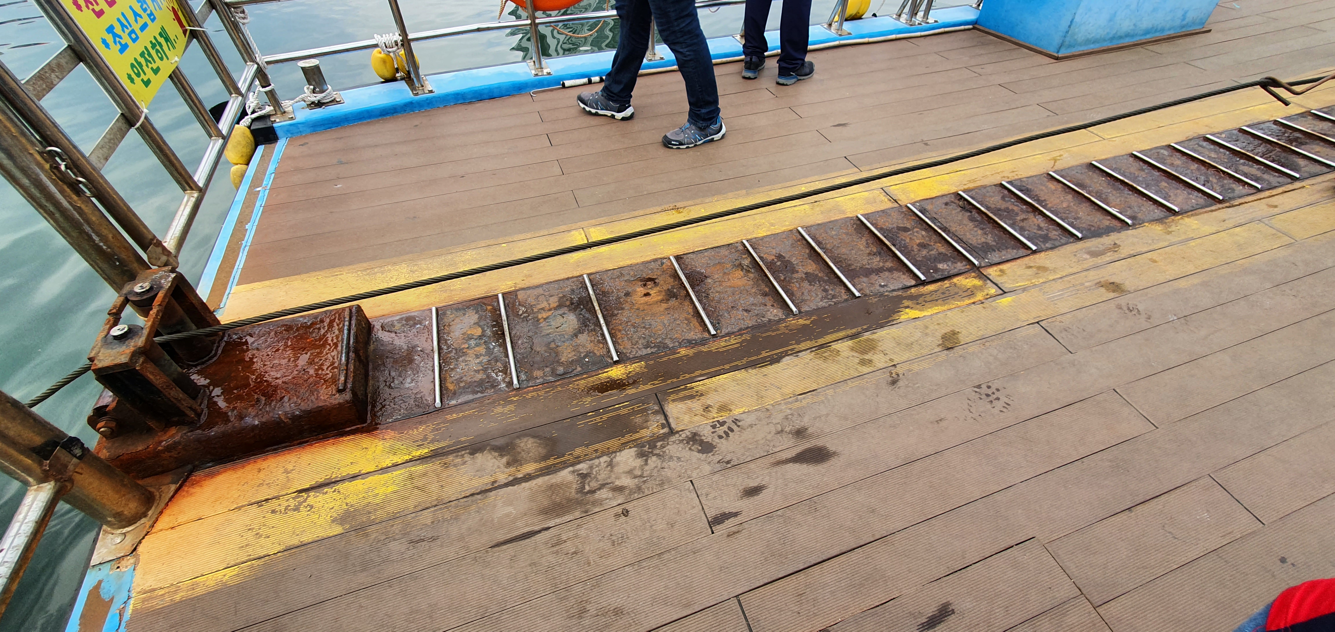 저 줄을 고리같은 쇠막대기를 이용해서 수동으로 끌면 갯배가 움직입니다 남자 직원 한분께서 운행하시는데
